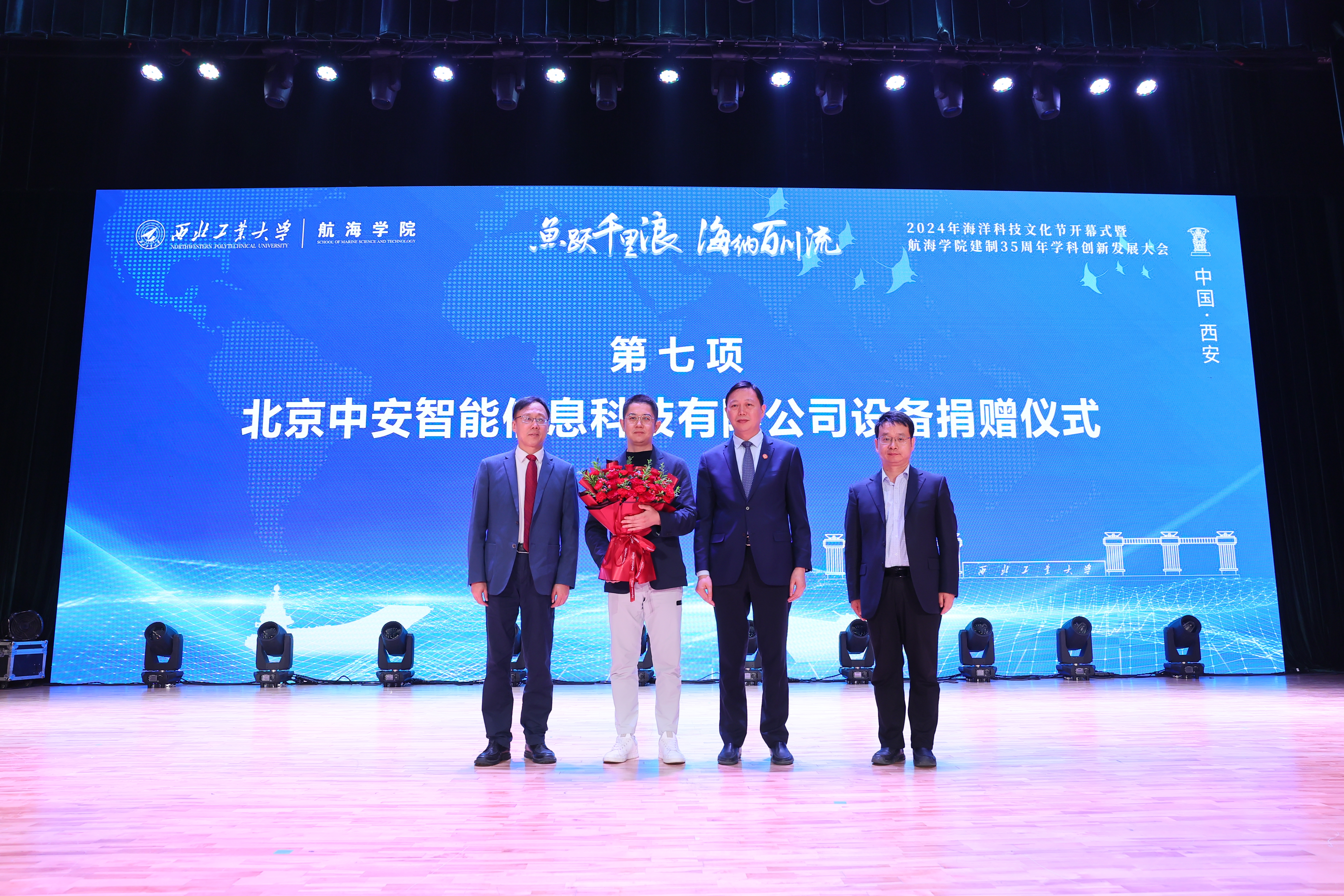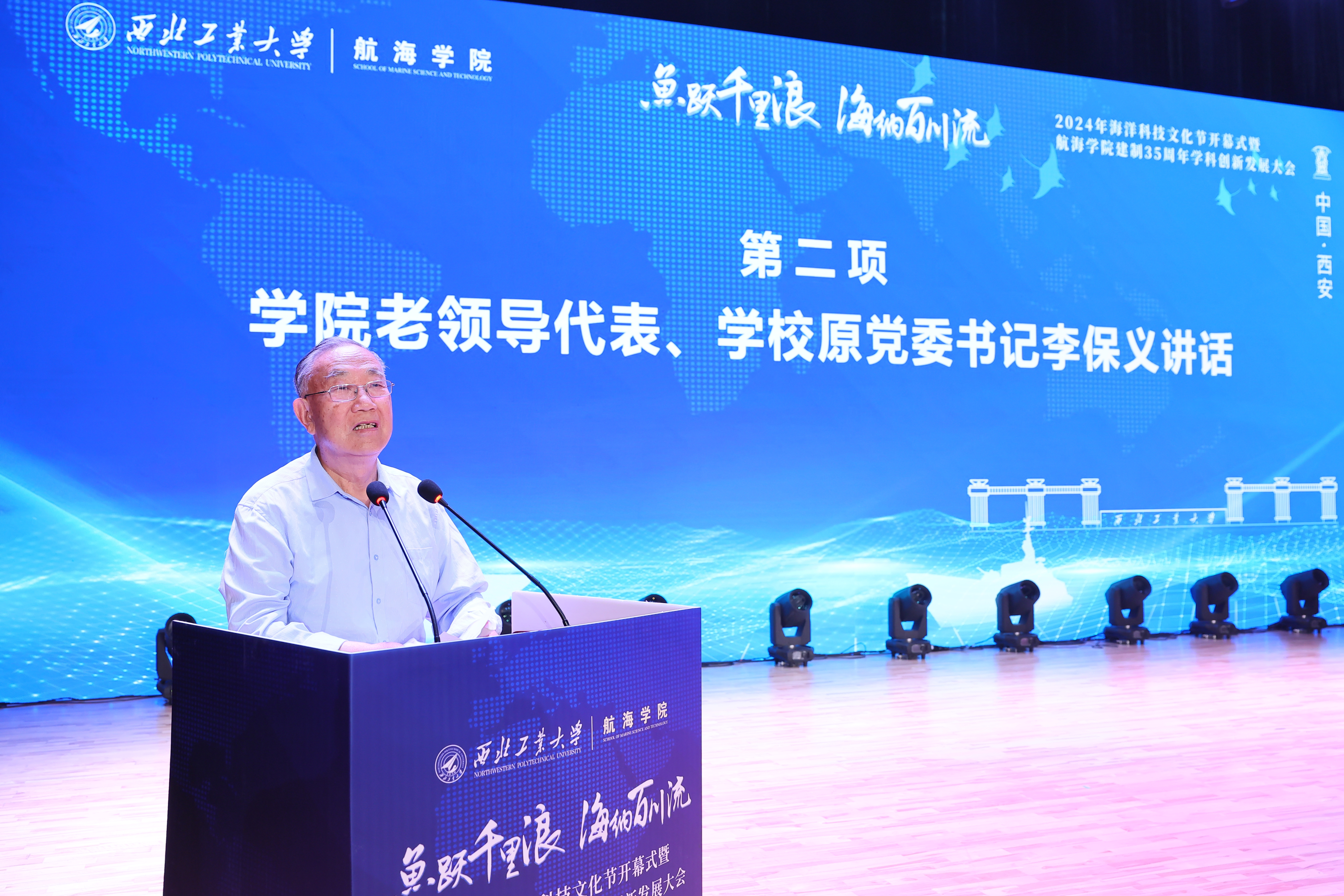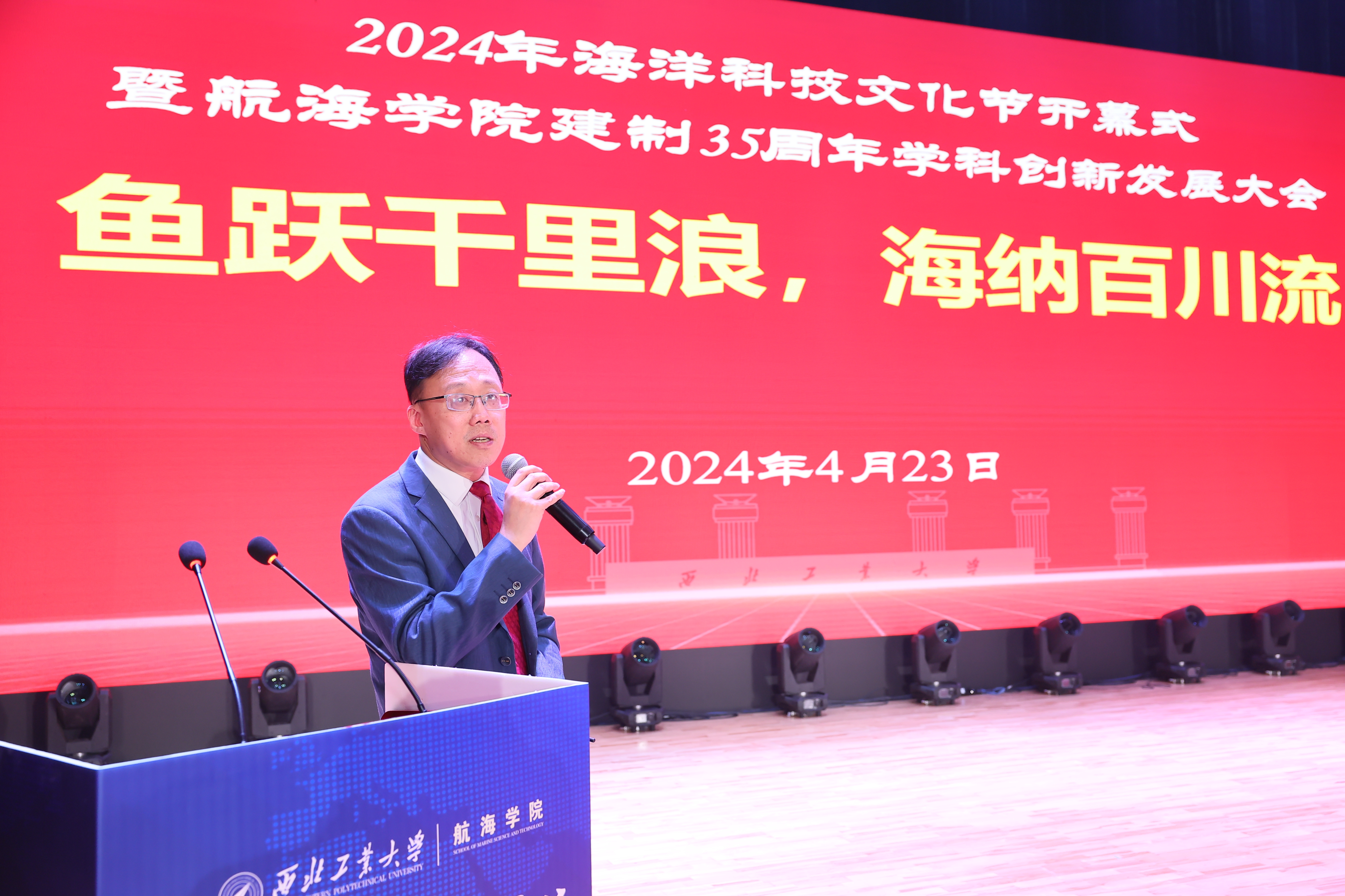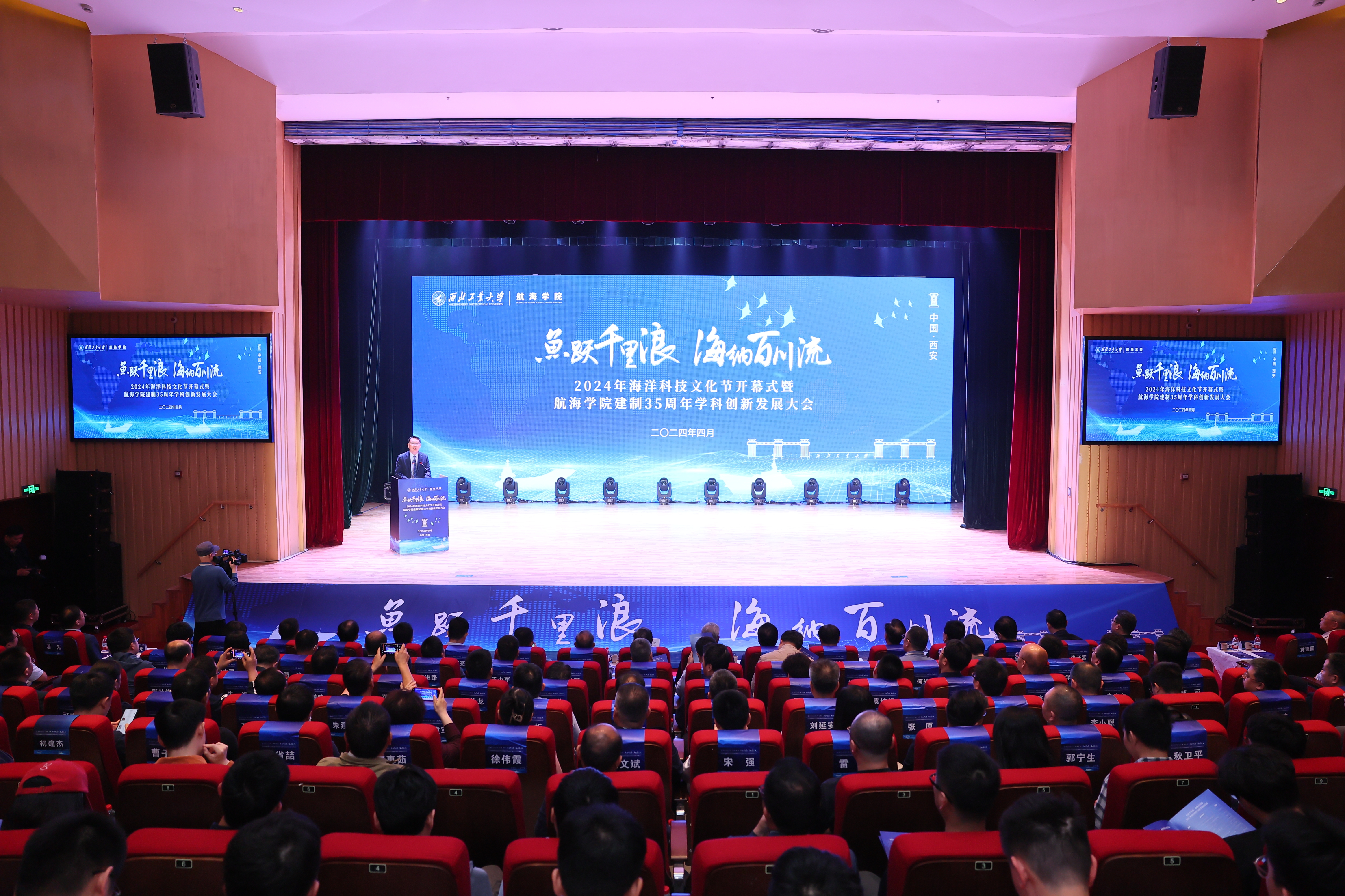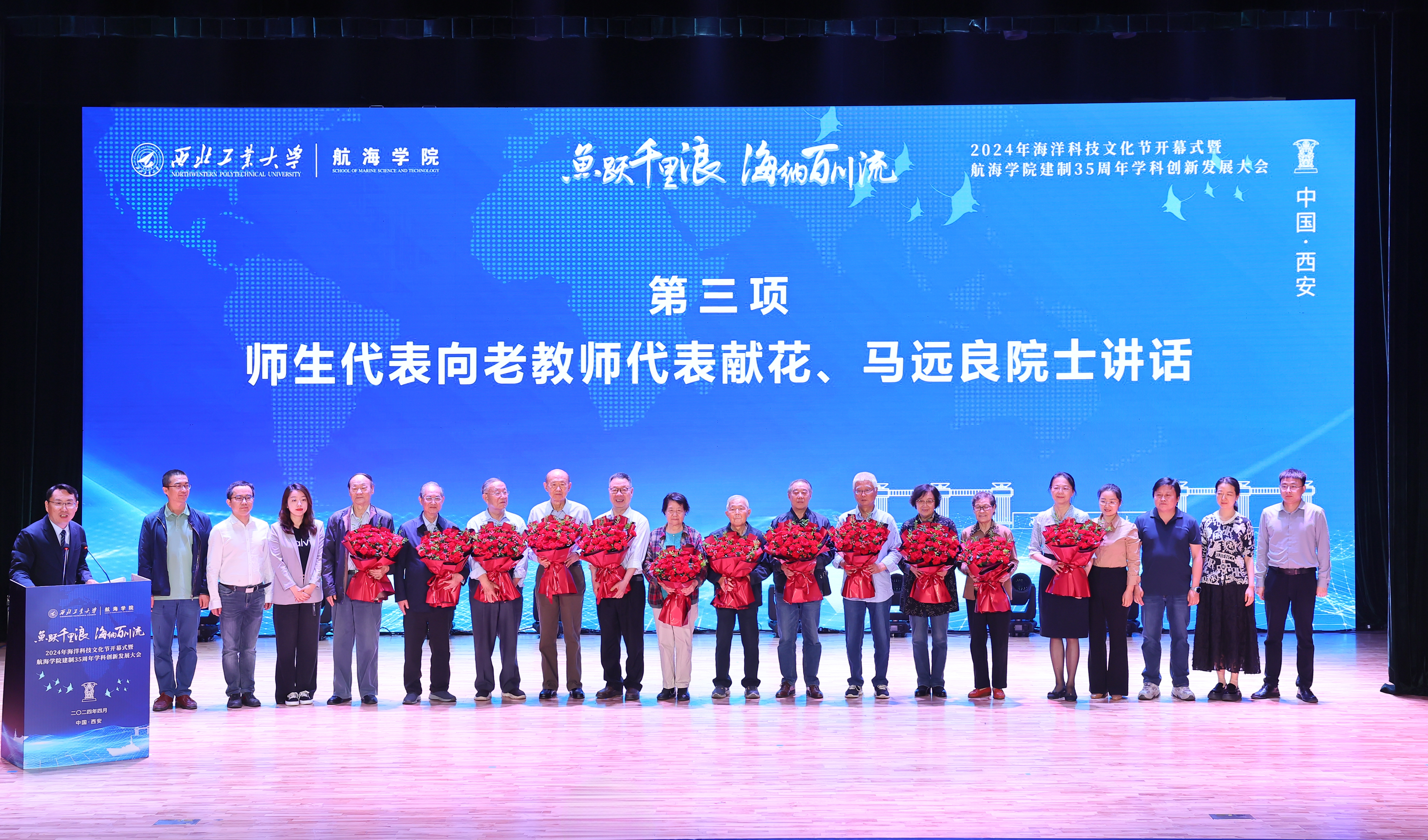 “鱼跃千里浪 海纳百川流”,恰逢我国第75个海军节,4月23日上午,BEAT3652024年海洋科技文化节开幕式暨航海学院建制35周年学科创新发展大会在长安校区隆重举行。中国工程院院士马远良、徐德民,BEAT365英国官网校长、中国工程院院士宋保维,原党委书记李保义,副校长杨益新、张开富,校友代表、中国造船学会副理事长刘郑国,陕西省科技厅一级巡视员赵怀斌,中国船舶第705研究所党委书记孙军亮,山西平阳机械厂董事长聂秋社,中国兵器工业集团第204研究所所长魏卫,西安工程大学校长王海燕等来自国内近百家行业院所、兄弟高校的主要领导、专家学者及学校各职能部门负责人,航海学院历任老领导,老教师代表、校友代表和师生代表等共计300余人参加开幕式。开幕式由航海学院党委书记刘朝亚主持。