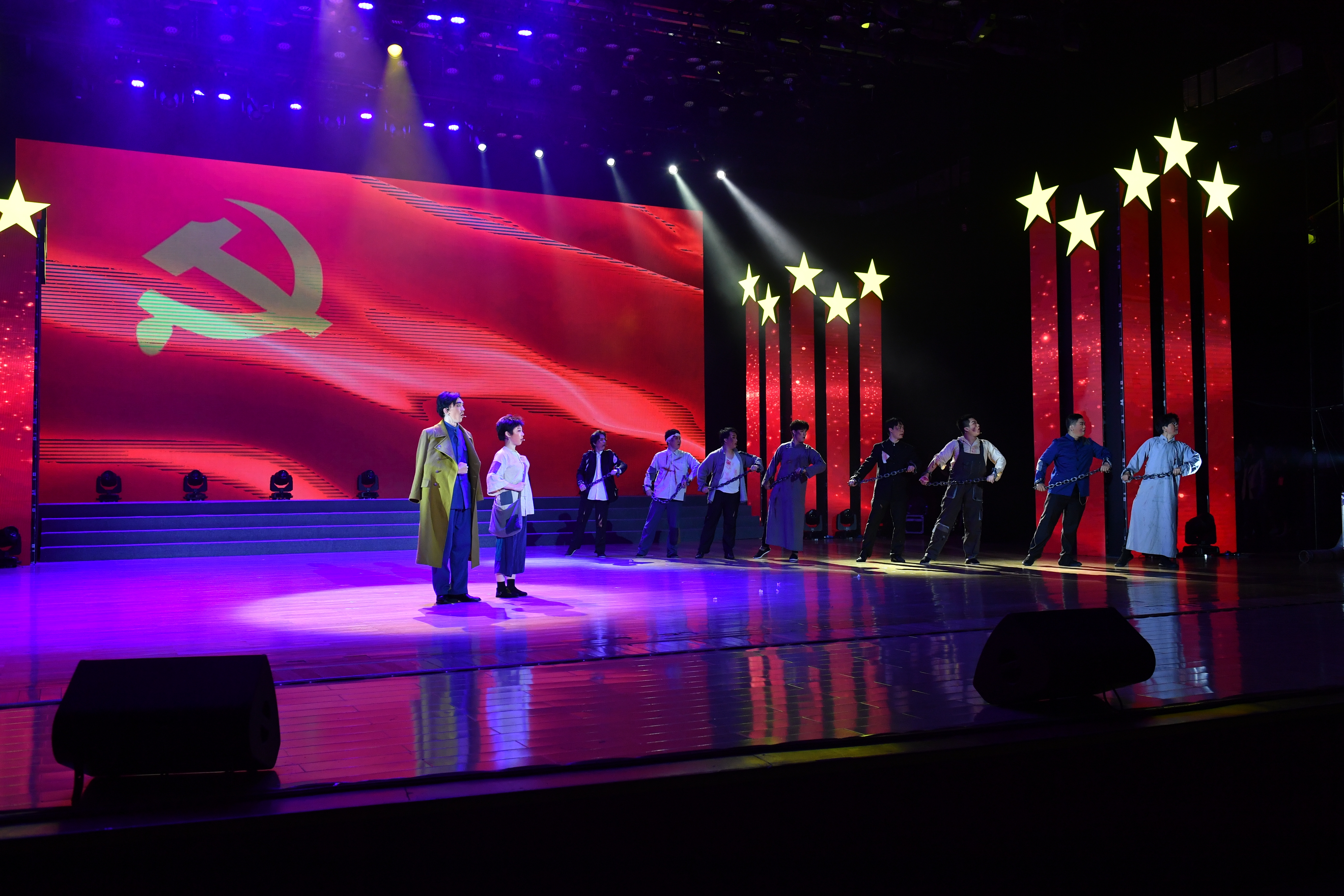 本次演出分为“青年何谓”“青年何为”“青年何往”三个主篇章,以创新舞台剧的形式追忆百余年间青年勇立时代之潮头的过往片段。交响《人民万岁》为本场演出拉开序幕。