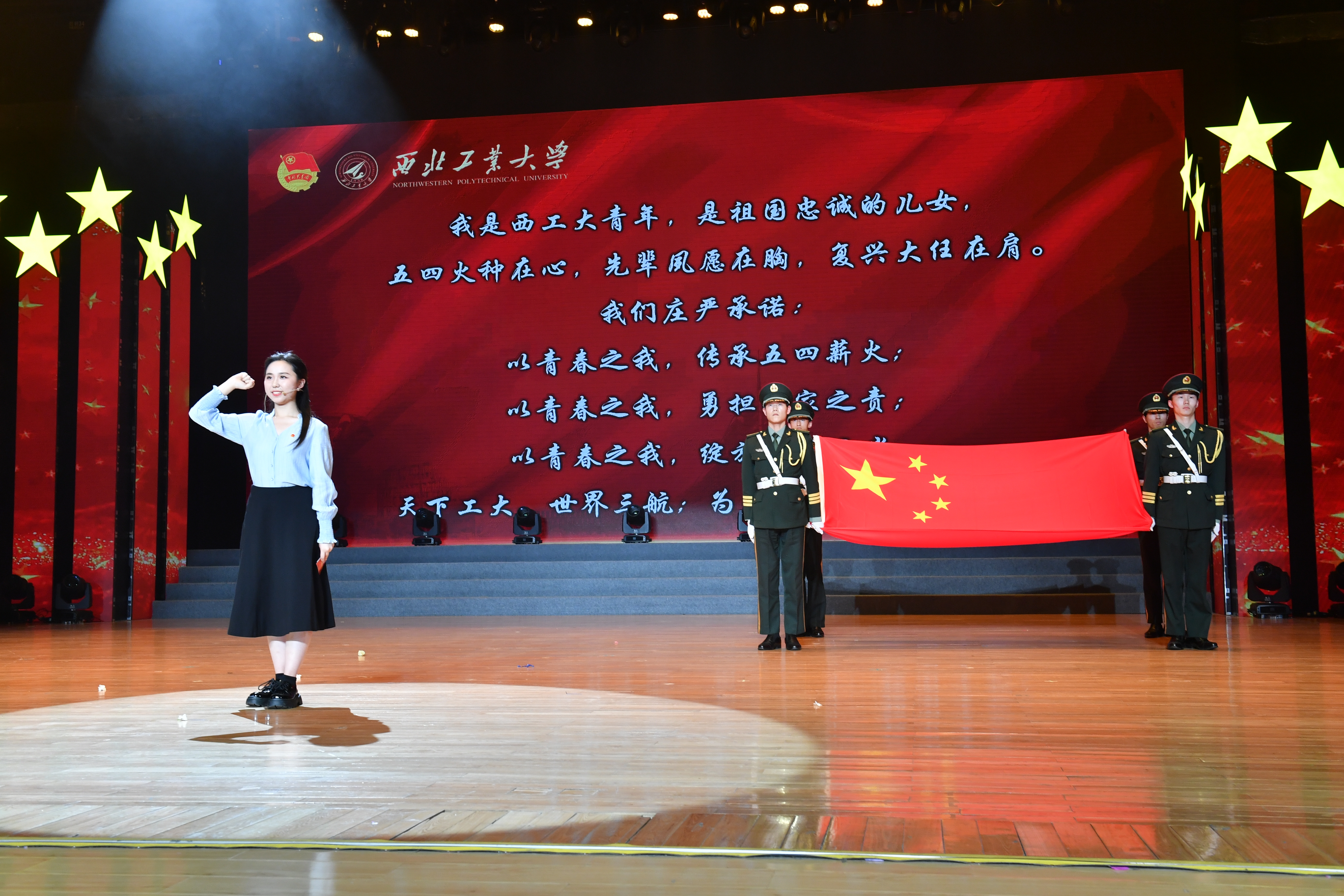 随后全场团员青年举起右拳,庄严宣誓,铮铮誓言,铿锵有力:我是西工大青年,是祖国忠诚的儿女,五四火种在心,先辈夙愿在胸,复兴大任在肩。我们庄严承诺:以青春之我,传承五四薪火;以青春之我,勇担国家之责;以青春之我,绽放时代之光。天下工大,世界三航;为国铸剑,强国有我!为国铸剑,强国有我!为国铸剑,强国有我!