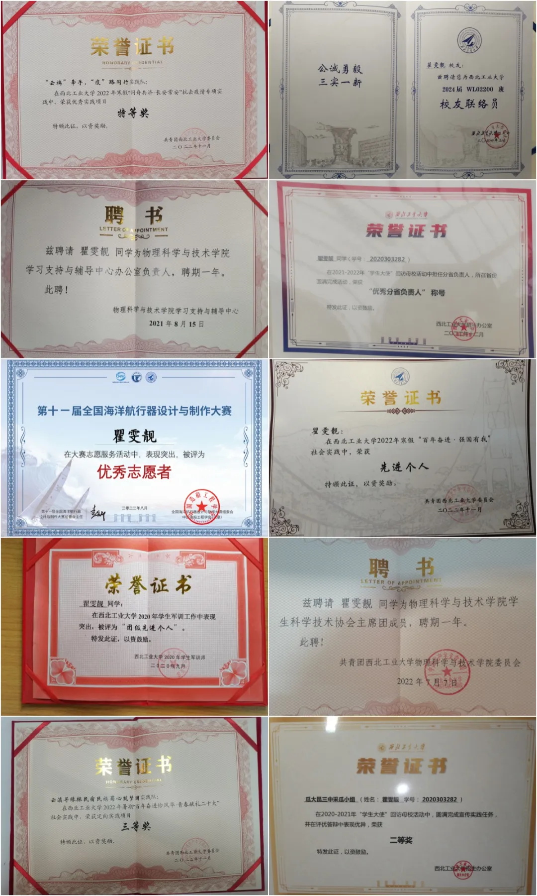 瞿雯靓工作、志愿服务所获的部分证书