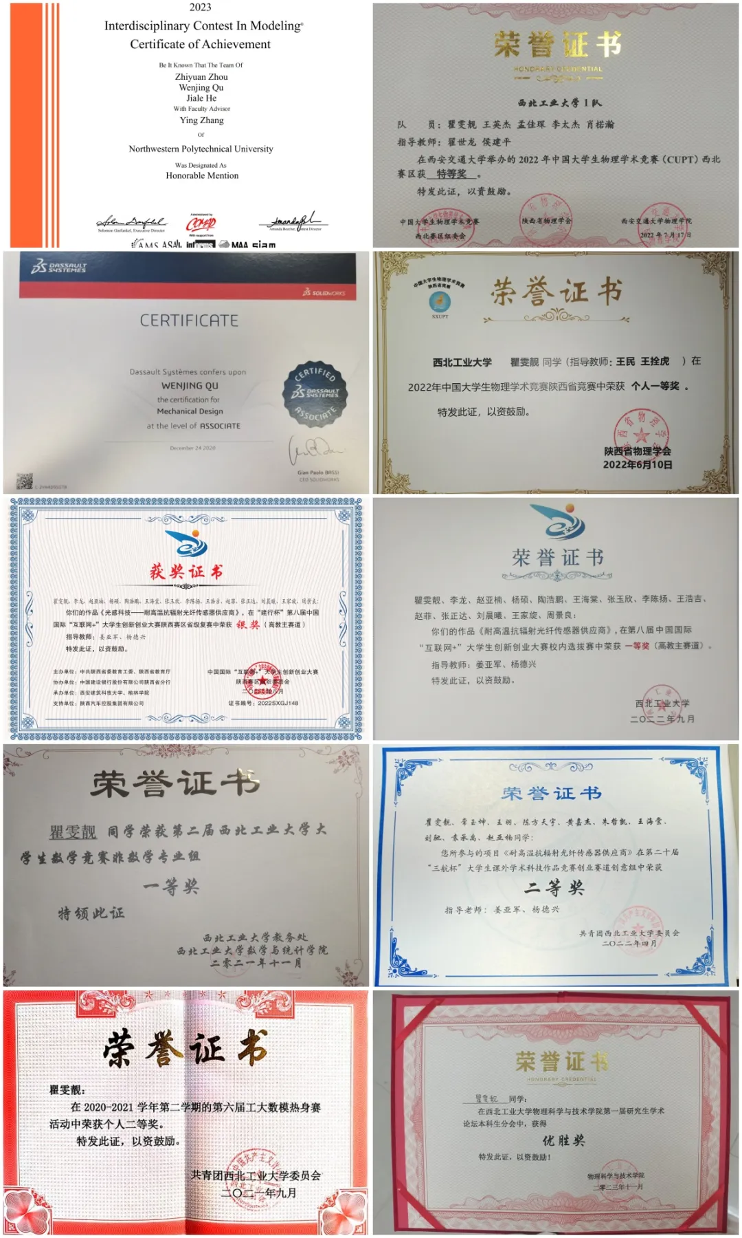 瞿雯靓的部分竞赛获奖证书
