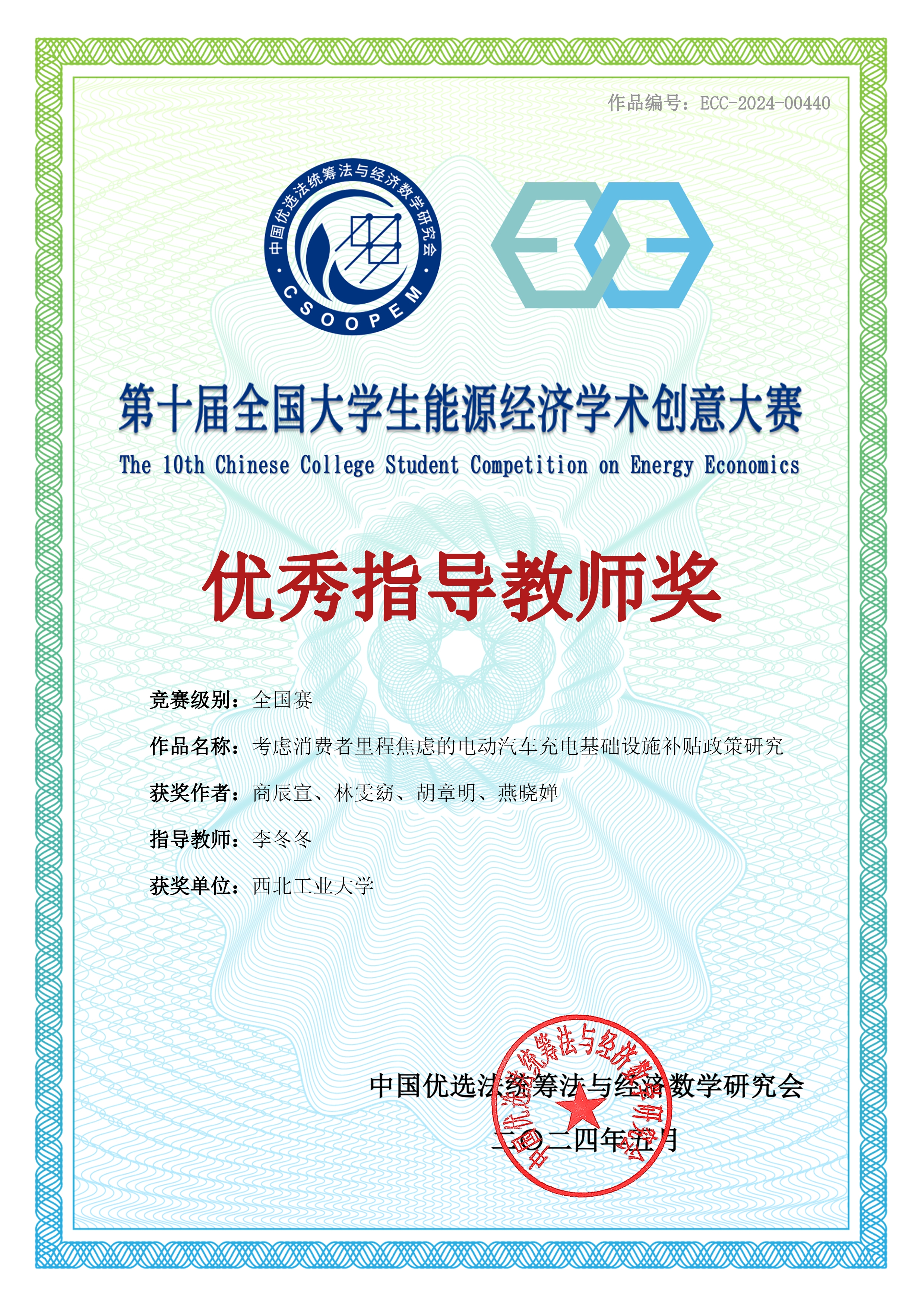 近日,第十届全国大学生能源经济学术创意大赛在中国地质大学(北京)成功举行。BEAT365公共政策与管理学院选送的参赛作品《考虑消费者里程焦虑的电动汽车充电基础设施补贴政策研究》荣获全国特等奖。项目指导老师李冬冬获得优秀指导教师奖。