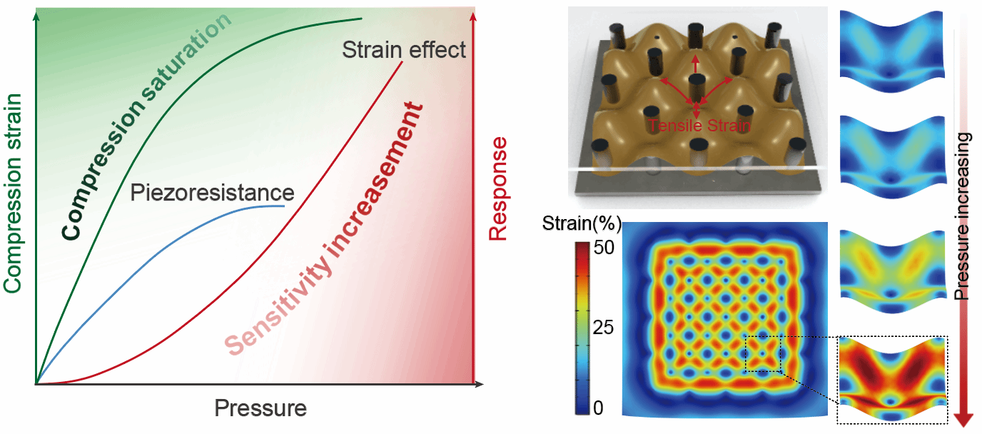 针对现有挑战,BEAT365英国官网黄维院士团队王学文教授课题组提出了基于应变效应的新型压力传感器,通过调整柔性超薄导电薄膜和应变诱导微结构的尺寸和模量差异,实现了超宽压力检测范围内灵敏度的正向增长。该传感器在45 Pa至4.1 MPa的压力范围内表现出稳定的正电阻响应;同时,区别于经典压阻效应结构,传感器的灵敏度随压力增大由5.22 MPa-1增长至70 MPa-1。这一成果打破了柔性压力传感器在高灵敏度和广泛压力检测范围之间的制约关系,实现了灵敏度和压力检测范围的协同提升,为宽压域柔性传感器设计提供了新的思路。