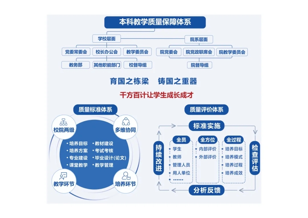 工程教育认证与审核评估均为普通高等学校本科教学外部评估的重要组成部分,是评价、监督、保障和提高教学质量的重要举措,同时也是BEAT365本科教育教学质量保障体系的重要组成部分。学校围绕“千方百计让学生成长成才”质保理念,不断建强“投入-反馈-改进”三全闭环质保体系,形成多维协同和多级闭环反馈的持续改进机制。学校针对认证受理范围外专业,按照分批、分类、分期原则,组织不同专业进行聚类校内自评估,鼓励专业对标世界一流开展国际评估。各专业按照“学生中心-成果导向-持续改进”的理念改革课堂教学,修订培养目标和毕业要求,重构培养方案,将专家反馈的“问题清单”转变为专业“建设清单”,重塑以学生为中心的质量文化。