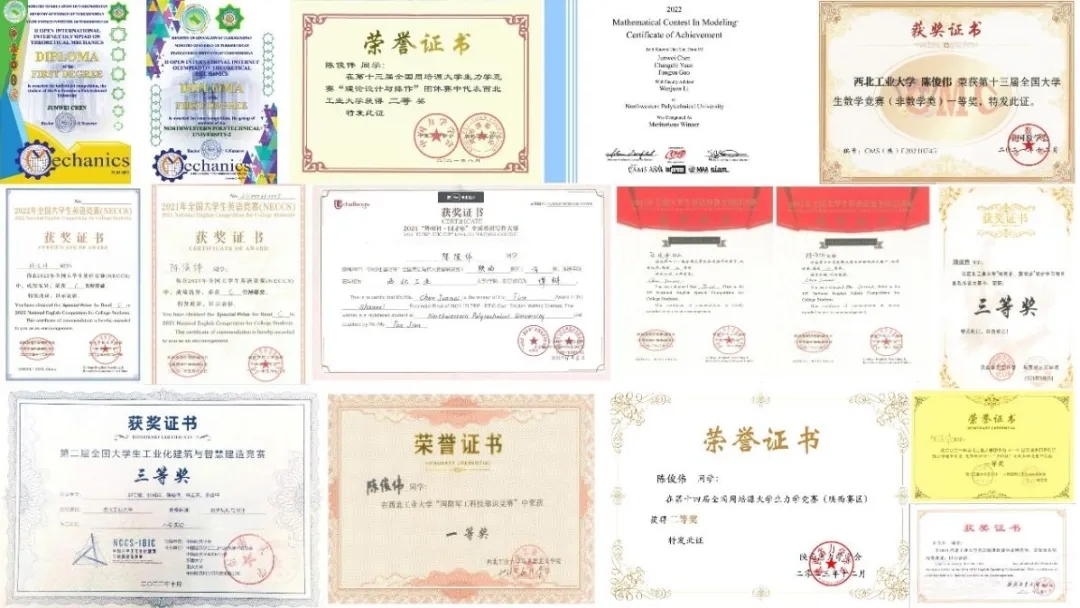 除了力学学科上的优异表现,陈俊伟还在多项基础学科竞赛中大展身手,获得了包括美国大学生数学建模竞赛M奖、全国大学生数学竞赛一等奖、全国大学生工业化建筑与智慧建造竞赛三等奖等竞赛奖项。作为一个工科男生,他在英语竞赛中也成绩斐然、硕果累累。累积获得全国大学生英语竞赛特等奖、夏令营风采赛全国二等奖、夏令营演讲赛全国三等奖、“外研社·国才杯”英语写作竞赛省一等奖等荣誉。六级考试取得649分,以雅思8.0分的高分通过,所撰写的雅思备考经验帖得到学校认可与推广。“凡所涉猎,皆无不精,博学广纳,志在功满”这16个字在陈俊伟身上体现的淋漓尽致。