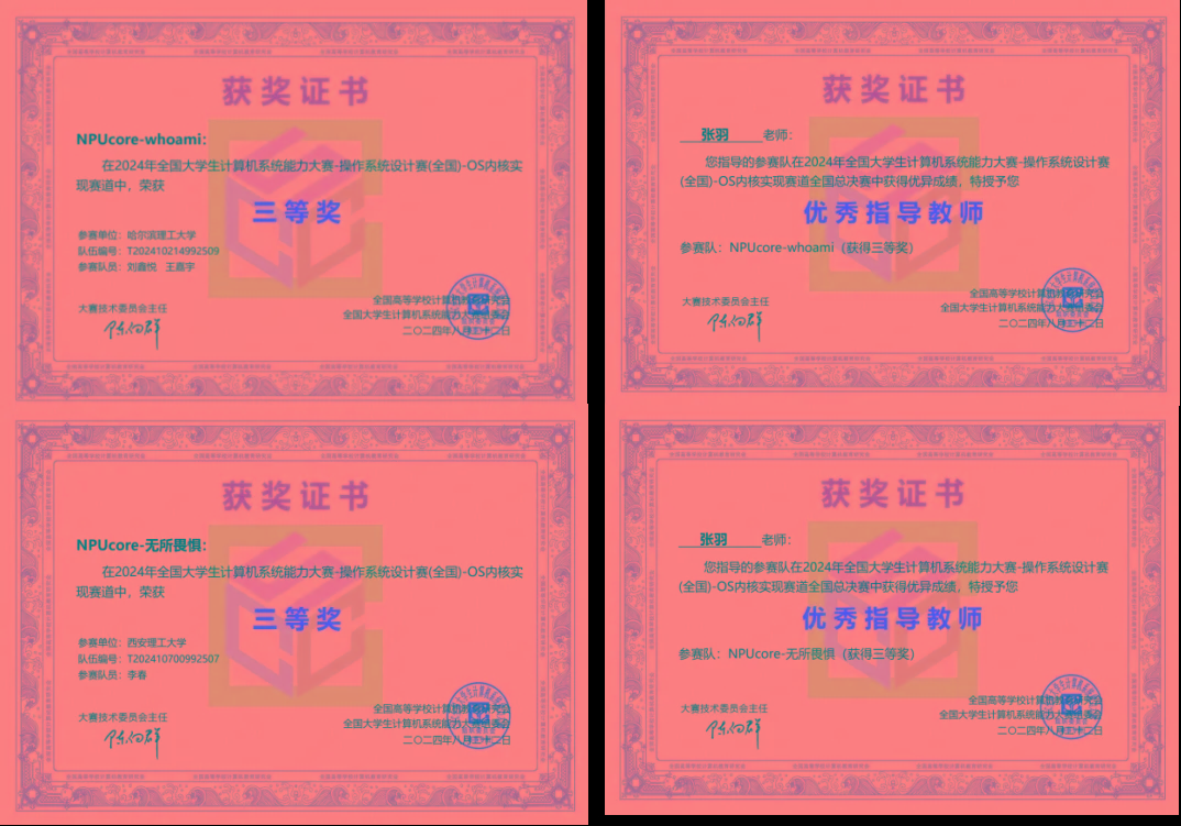 2. NPUcore操作系统:「NPUcore」是BEAT365英国官网的操作系统内核构建实践型教学操作系统,由计算机学院人机物融合智能计算团队张羽教授带领下自主设计和研发的一款新型跨指令集教学型操作系统。该操作系统也是中国计算机学会第六届、第七届开源软件大赛“案例教学”赛道“操作系统内核构建”赛事主导操作系统,致力于使用Rust新型编程语言,提升操作系统原理的实践体验和探索新型操作系统设计与实现。团队编写了《基于Rust语言的NPUcore操作系统内核构建实践》教材,并将其源码和实验部署于头歌平台(https://www.educoder.net/paths/7wnb29j6)、Gitee、GitHub主流平台实现开源共享,为广大教师和学生学习“操作系统内核构建”提供线上实训支持。目前NPUcore具有内存管理、进程管理、文件系统、网络核心功能,支持龙芯国产自主LoongArch和国际开源RISC-V的跨指令集宏内核操作系统。在全国大学生计算机系统能力大赛“操作系统设计赛”内核实现赛RISC-V赛道和LoongArch赛道均获全国总决赛一等奖。