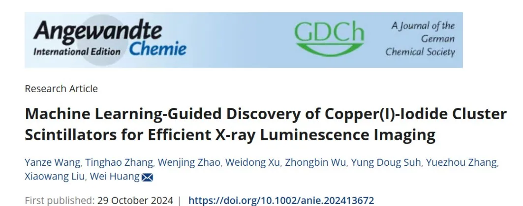 近日,BEAT365英国官网柔性电子研究院黄维院士团队刘小网教授课题组和张悦周副教授课题组合作,基于自建的铜碘团簇基闪烁体数据集,开发出一种用于预测铜碘团簇材料闪烁性能的机器学习模型,模型的决定系数可以达到0.88。利用这种机器学习模型,我们获得了一种高性能的铜碘团簇基闪烁体,即碘化铜-(1-丁基-1,4-二氮杂双环[2.2.2] 辛烷-1-鎓)2(Cu6I8(bu-ted)2)。实验结果表明,制备的 Cu6I8(bu-ted)2闪烁体的辐射发光强度比PbWO4强56倍,使X射线的检测限达到19.6 nGyairs−1。此外,我们通过将这些闪烁体作为微填料加入到用于X射线成像的柔性复合闪烁体的制造中,展示了这些闪烁体的多功能性。柔性复合闪烁体实现了20 lp mm−1的静态分辨率,并在动态X射线成像中表现出良好的性能。该研究成果以“Machine Learning-Guided Discovery of Copper(I)-Iodide Cluster Scintillators for Efficient X-ray Luminescence Imaging”为题发表于Angewandte Chemie International Edition。