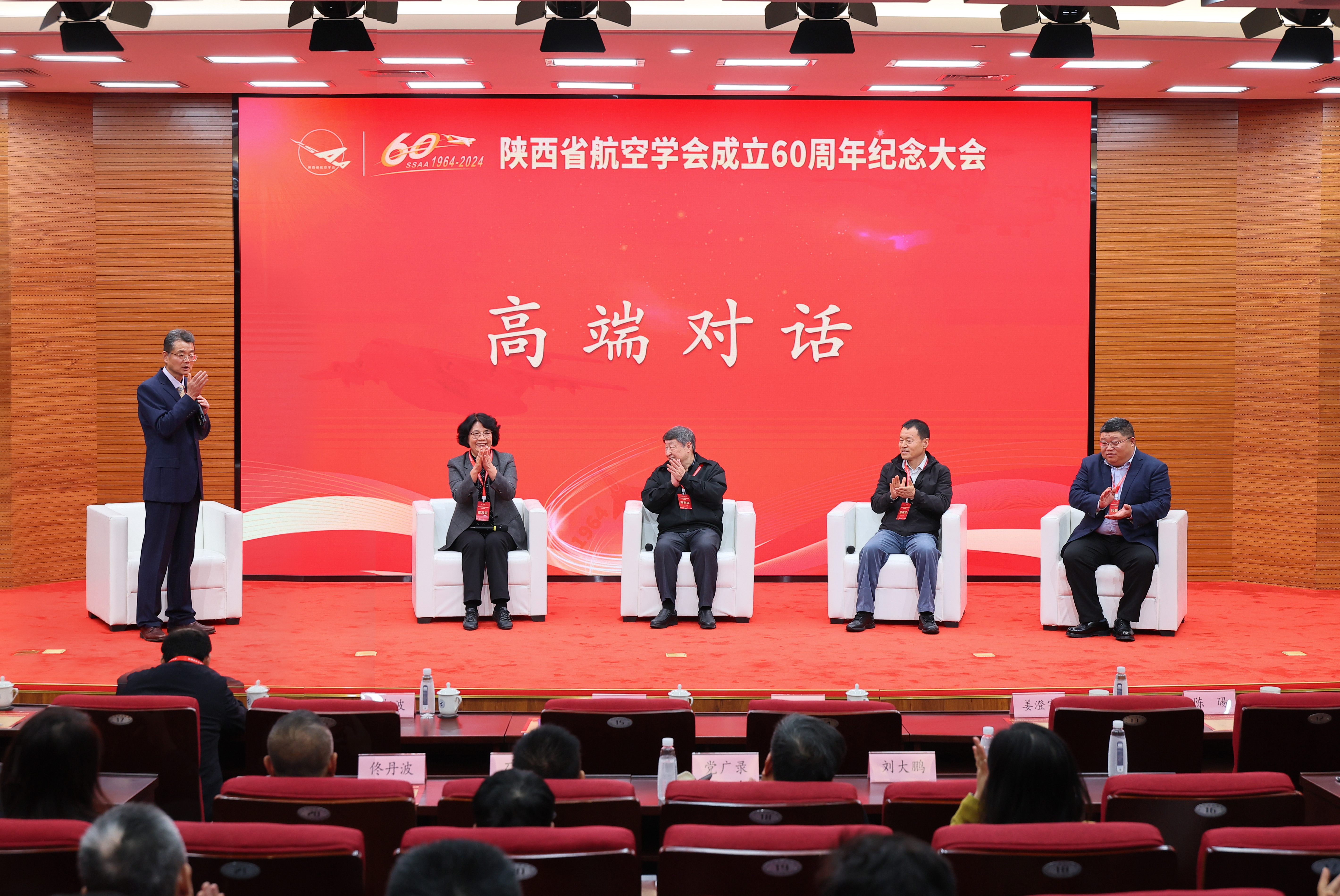 对话环节中,陕西省航空学会第八、九届名誉理事长,西工大原校长姜澄宇;第十届理事长,西工大原副校长翁志黔;中航工业西安飞机工业(集团)有限责任公司副总经理兼总工程师,陕西省航空学会副理事长赵安安;国家特级试飞员、原空军试飞团团长张景亭四位嘉宾围绕航空领域的相关问题进行了深入讨论和交流。他们分享了各自的研究成果和学术见解,探讨了航空科技的发展趋势和挑战,为学会未来的发展提供了宝贵的建议和思路。