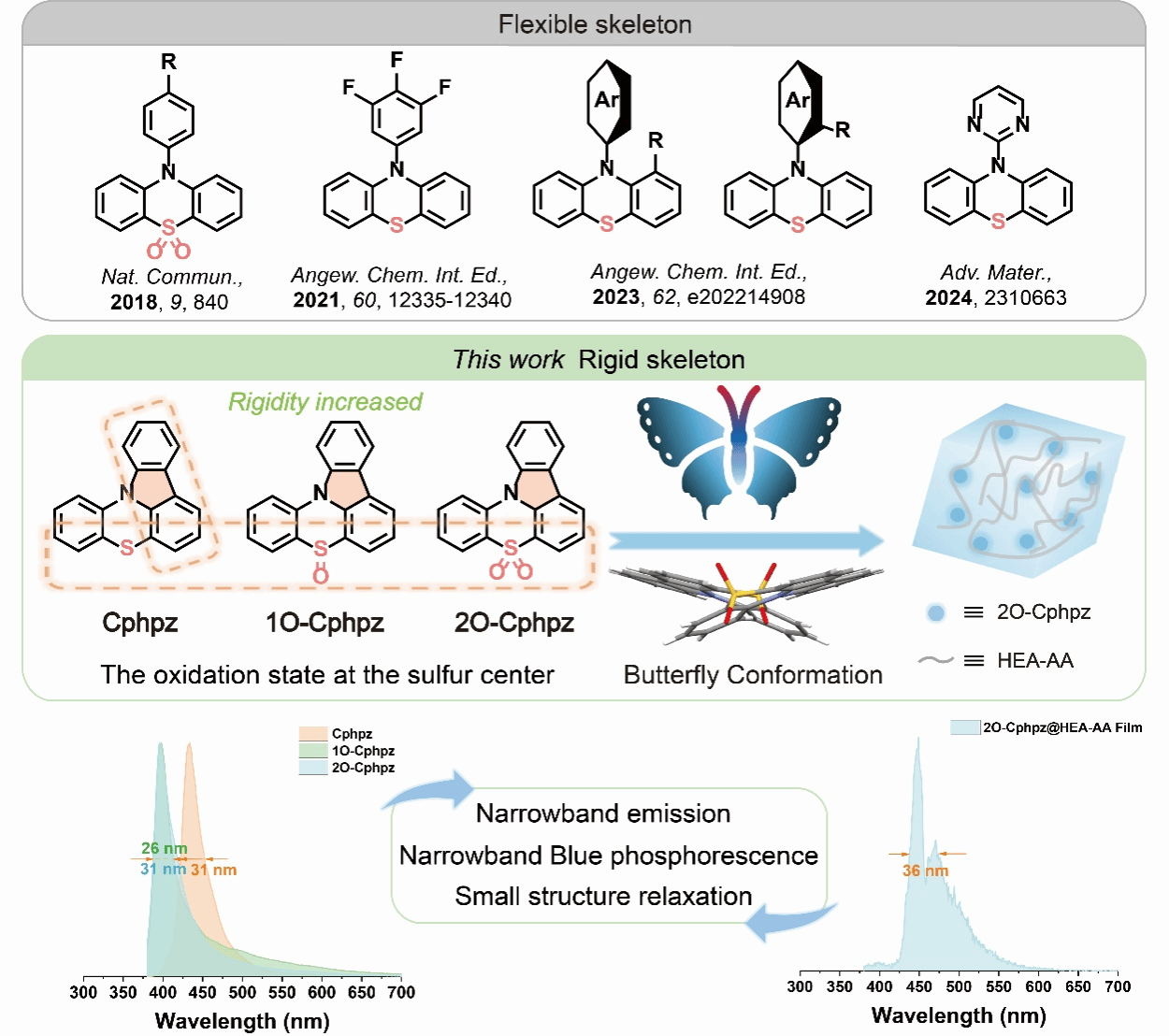 近年来,具有高色纯度优势的有机窄带发光材料因其在高分辨率成像、显示、传感、识别等方面的潜在应用而受到极大的关注。有机窄带荧光材料作为热点话题近期深受研究者们的喜爱,但本征型有机室温磷光材料尚未实现。因此,在光电领域开发一种新型设计原则来实现具有高颜色纯度、稳定性优越的本征窄带蓝色室温磷光材料至关重要,同时也是一项重大的挑战。