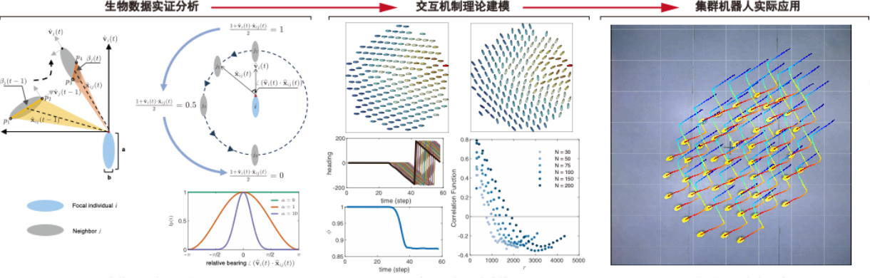 团队针对这一热点研究问题开展了涵盖生物数据实证分析、交互机制理论建模及机器验证的全链条研究。通过从第一视角分析鱼群集体转向的轨迹数据,发现身体朝向变化更显著的个体通常在转向过程中扮演领导者角色,对群体方向的快速调整起到了关键作用。基于这一实证分析,团队设计了一种基于邻居身体朝向变化的局部交互模型,通过优先响应身体朝向变化显著的邻居,不仅可以在群内高效传递方向信息,使群体快速而准确地完成避险任务,还能促使群体自发涌现出尺度无关协同的宏观现象。最终,成功将该机制应用于由50台微型轮式机器人组成的集群,展现出高效的群体响应能力。这一发现为构建低成本、高性能的水下无人集群系统提供了新质感知要素。