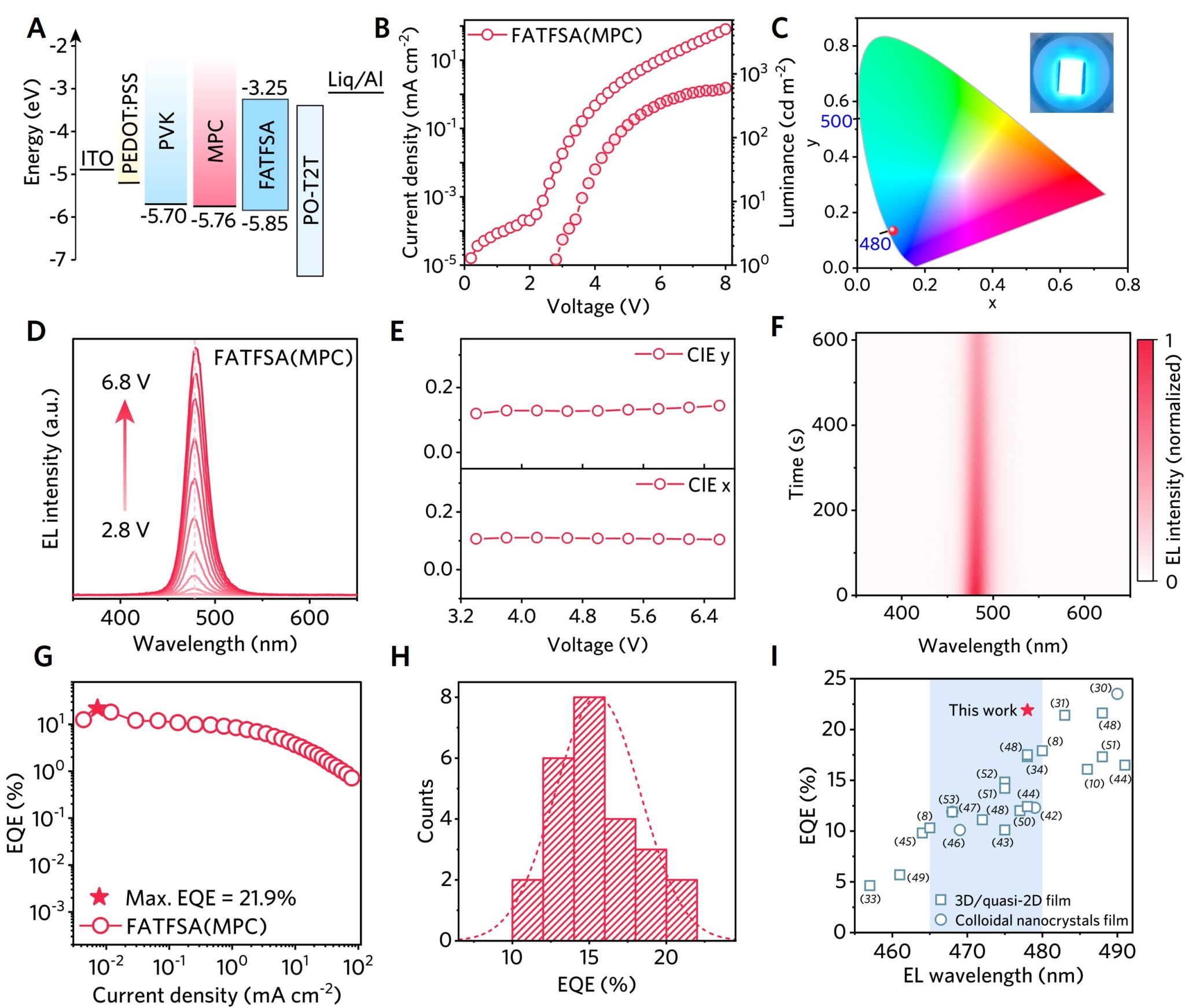 图5. 基于四氟丁二酸甲脒和双亲性分子的体相-界面优化的钙钛矿发光二极管性能。