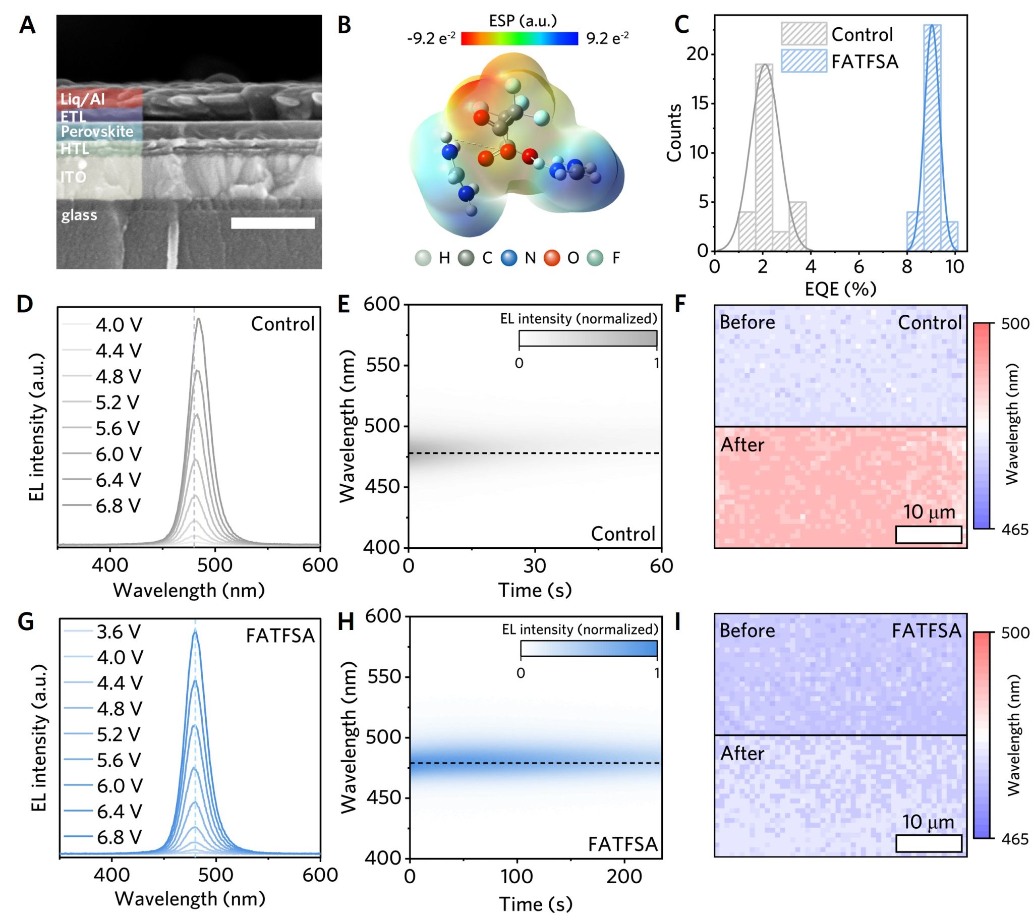 图1. 四氟丁二酸甲脒掺入对钙钛矿发光二极管性能的影响。