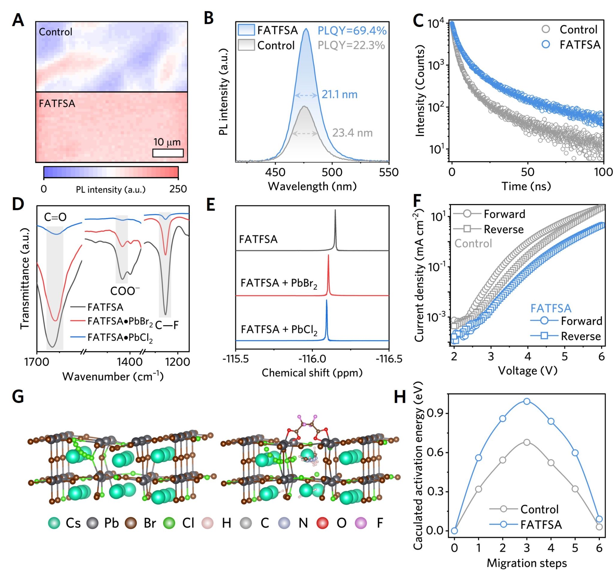 图2 . 四氟丁二酸甲脒提升钙钛矿发光二极管性能的机理研究。