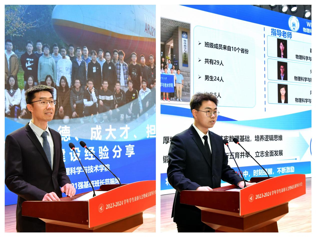模范班级代表、物理科学与技术学院2021级强基班班主任宋坤、班长范振坤携手上台,从“坚定理想信念,厚植报国情怀”“筑牢数理基础”“提升科学素养,锻炼科研能力”“践行五育并举,立志全面发展”四个方面分享了大家互信互助,走进大团队、走上大舞台,“如同物理学中的合力与分力,相互依存、不可分割”的成长故事。模范研究生导学团队代表、航海学院“智能仿生潜水器”科技创新团队指导老师叶鹏程与硕士研究生李鑫,共同讲述了团队秉持“向海图强,向海而兴”理念,面向国家海洋安全和资源开发战略需求,依托自主水下航行器团队将立德树人与科研实践相结合的青春宣言。