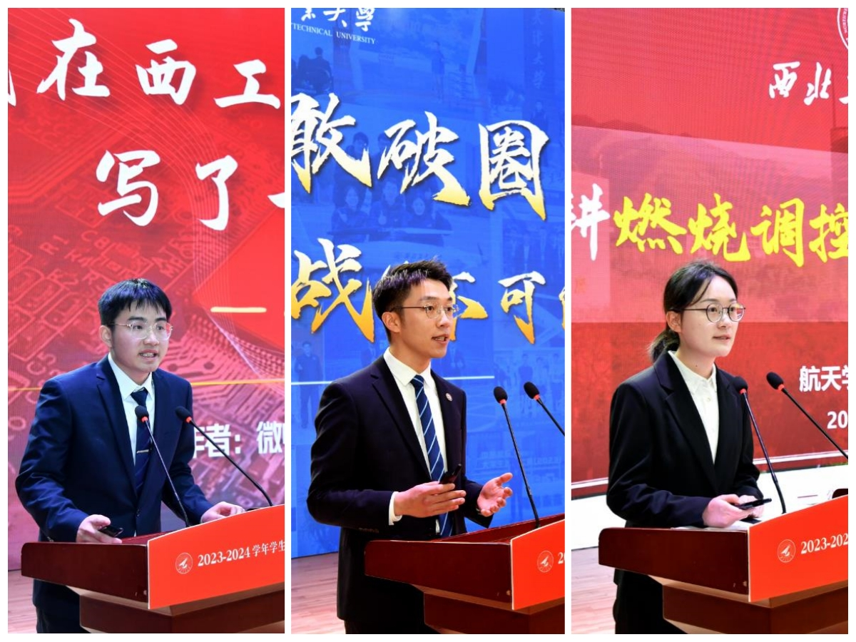 优秀大学生标兵代表、微电子学院2021级本科生孙鹏程同学以“笃学铸芯、守正创芯、奉献红芯”为主线讲述了自己入学以来在西工大“总师育人文化”引领下“从一颗沙砾变成芯片”的蜕变故事。优秀研究生标兵代表、国家卓越工程师学院2023级硕士研究生付一方同学结合面向动基座平台无人机自主空中对接控制技术研究这一研究课题,分享了自己脚踏实地走好科研探索之路,努力“破圈”的所思所悟。航天学院2022级博士研究生刘露围绕“科研创新应当顶天立地”这一主题分享了自己在导师和团队的熏陶影响下,瞄准国家战略需求加强科研攻关以及践行“问题从工程中来,成果到工程中去”的科研心得体会。
