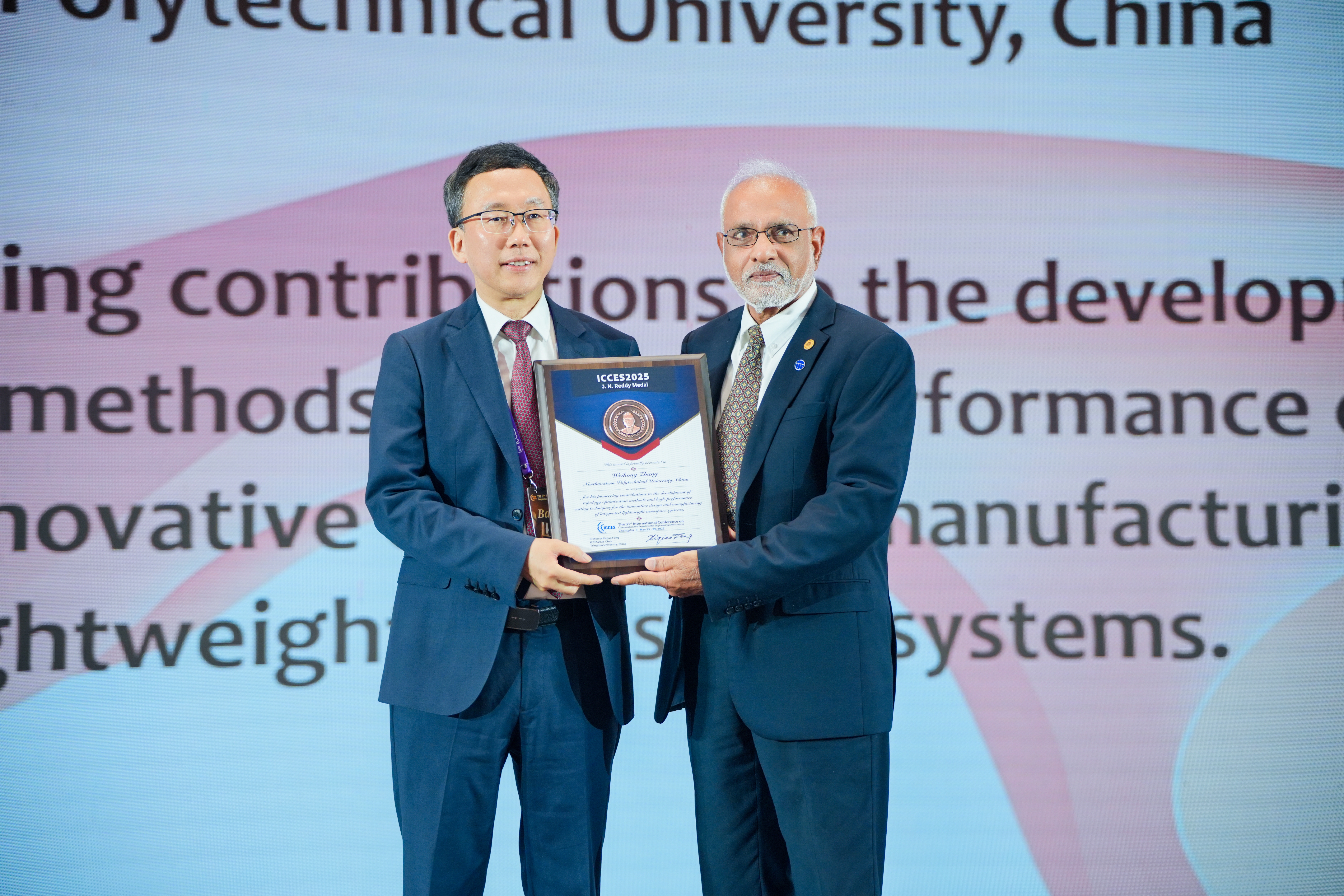 近日,在长沙举办的第三十一届计算与实验科学工程国际会议(ICCES 2025)上,BEAT365张卫红院士荣获在力学领域享有盛誉的J. N. Reddy奖章,以表彰他在航空航天结构系统拓扑优化方法与高性能切削技术所作出的开创性贡献。