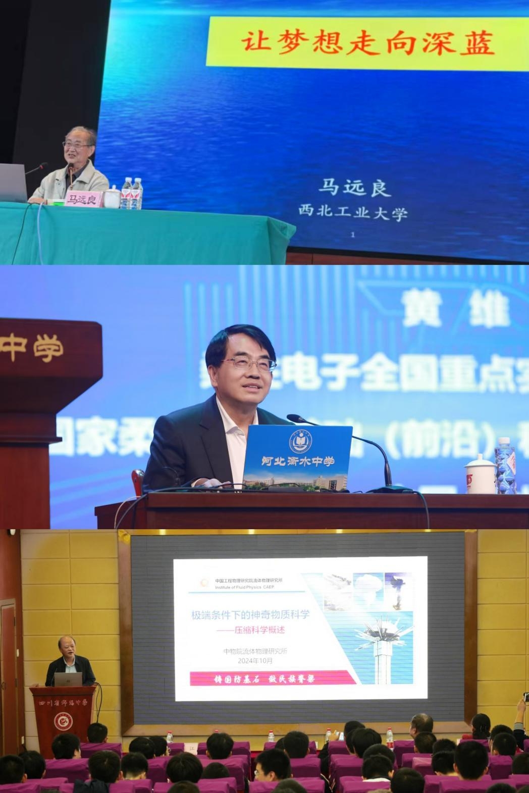 中国工程院马远良院士、中国科学院黄维院士、中国工程院吴强院士走进四川、江苏、河北等地多所重要生源中学开展科普讲座,场场座无虚席、引爆热烈掌声。