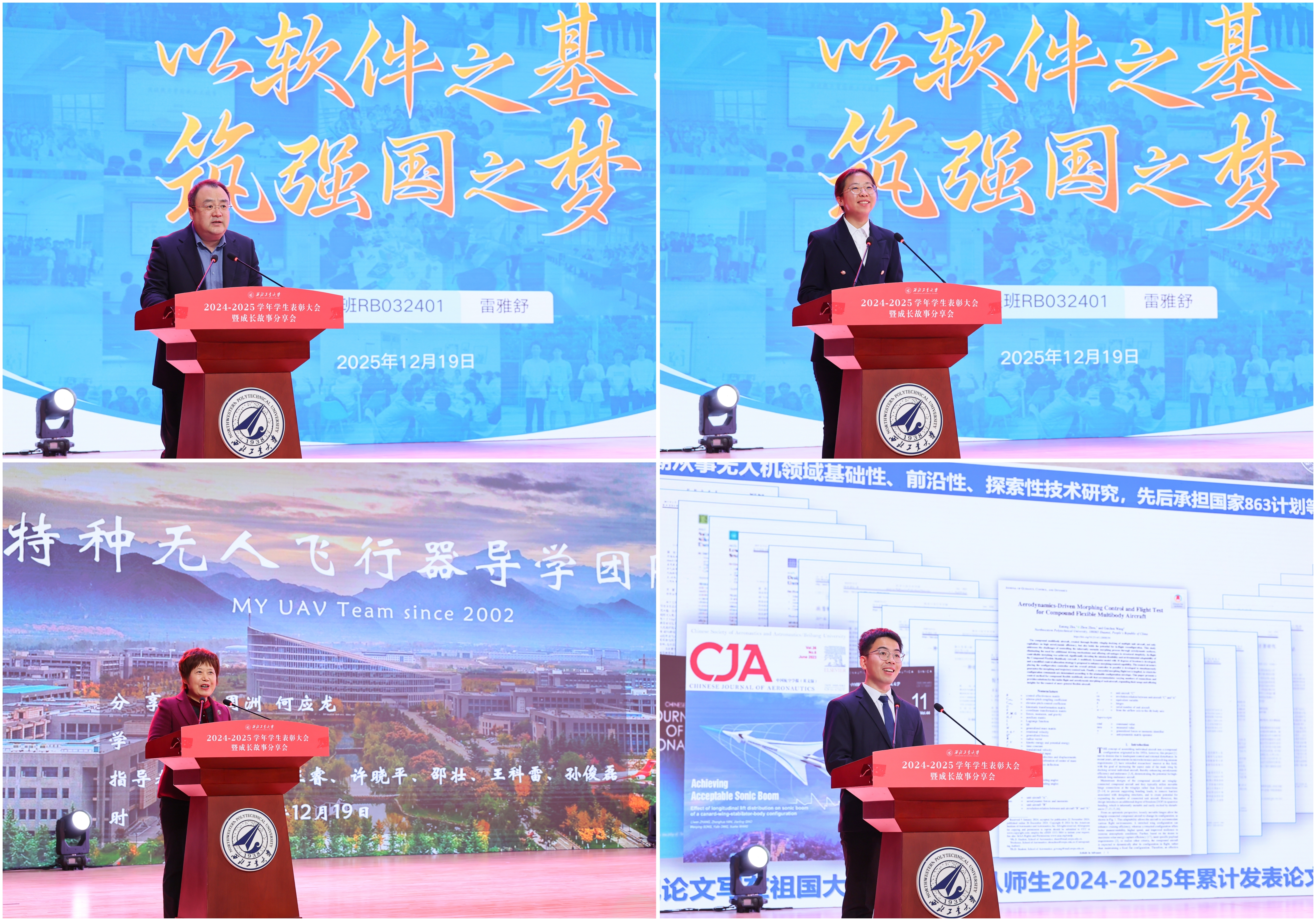 模范班级代表、软件学院2024级“拔尖创新”班班主任郑江滨教授与学生代表雷雅舒共同登台,分享了他们以“软件报国”为初心,将代码写在强国建设的征程中,在互助共进中实现集体“六道100%”全面发展的奋斗故事。模范研究生导学团队代表、航空学院特种无人飞行器导学团队指导老师周洲教授与硕士研究生何应龙同台展示团队的育人理念和丰硕成果。团队秉承“只做第一,不做第二”“戴学位帽先戴草帽”的理念,围绕国家核心需求,二十三年如一日持续深耕,终实现关键技术突破,“将论文写在祖国蓝天高原”。