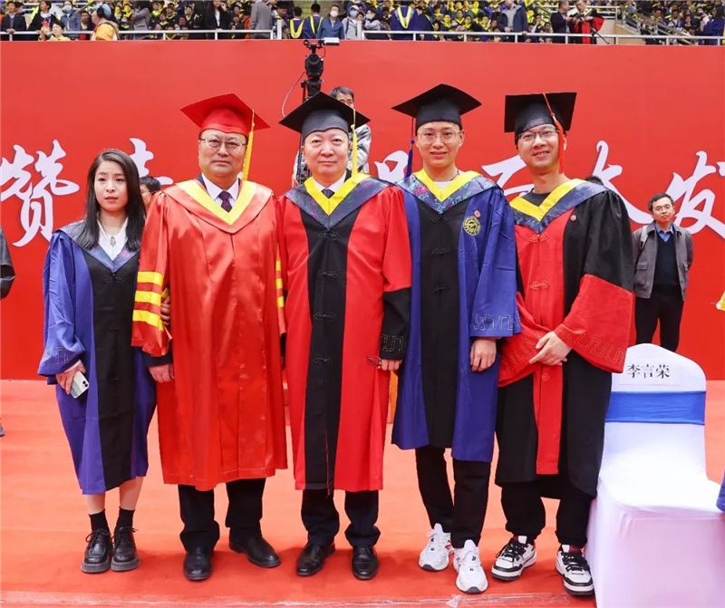 校领导、院士、杰出校友们为毕业生代表拨穗正冠、颁发毕业证书并合影留念。