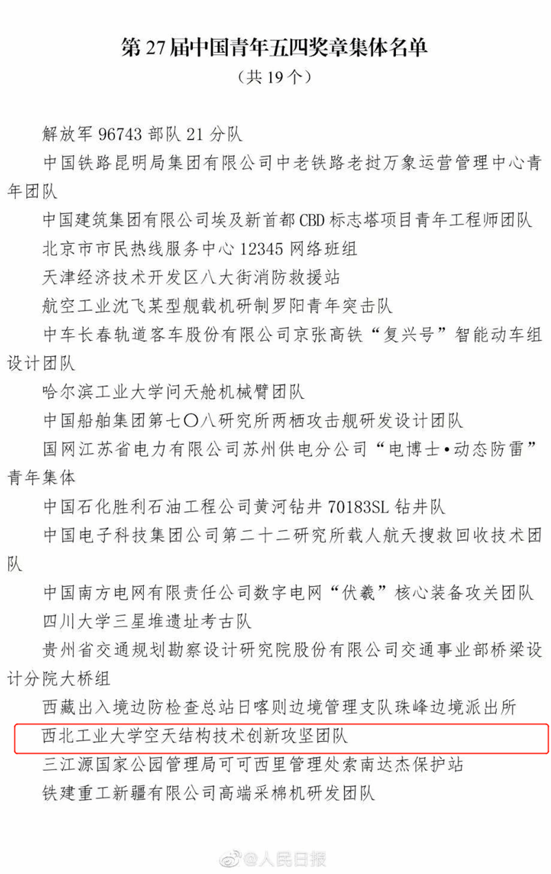 BEAT365英国官网空天结构技术创新攻坚团队成功入选获奖集体,这也是学校首次荣获中国青年五四奖章集体奖。