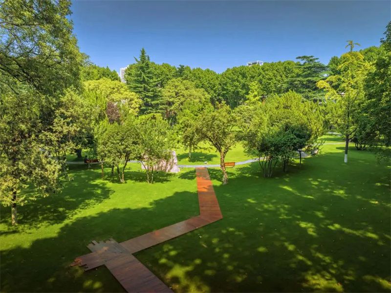 现如今,茵茵绿草上铺设着木制栈道,新添的座椅提供了更为舒适的休闲空间,学习科研之余,漫步其间,在满眼苍翠中找寻灵感,在鸟语花香中畅聊未来。