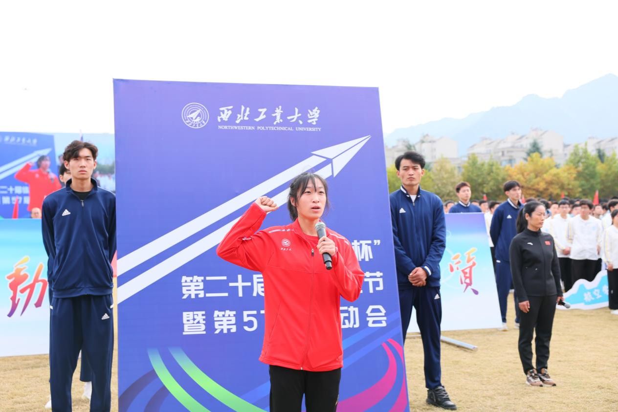 全国大学生田径锦标赛三级跳远冠军张苗苗同学代表全体运动员、牛清梅老师代表全体裁判员先后宣誓,保证尊重体育精神、尊重对手、尊重规则,公平参赛、公正执法。