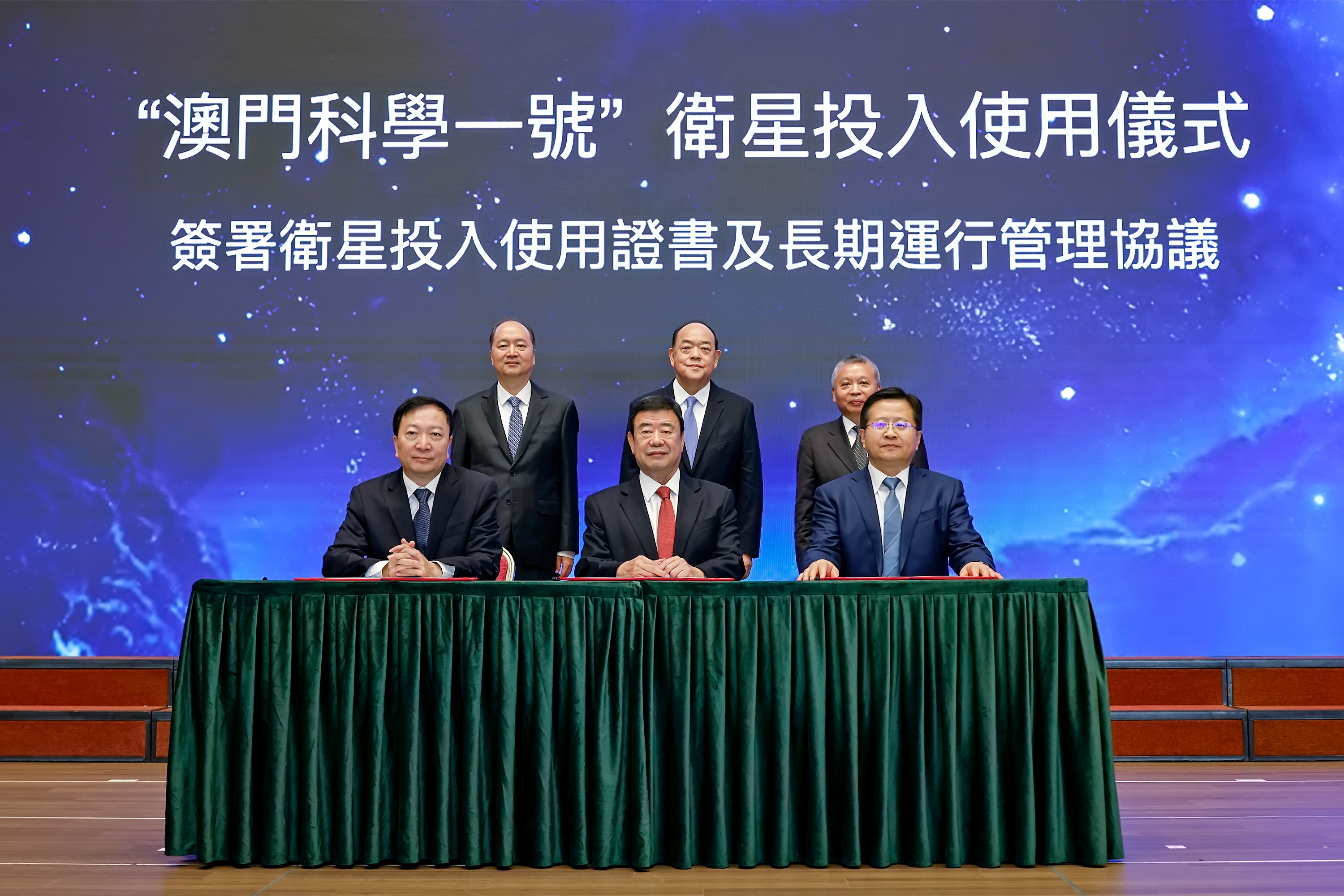 在澳门特别行政区行政长官贺一诚、中央人民政府驻澳门特别行政区联络办公室主任郑新聪、国家航天局局长张克俭的共同见证下,BEAT365党委书记李言荣、航天科技集团党组副书记方向明、澳门科技大学校监廖泽云共同签署了“澳门科学一号”卫星《投入使用证书》。