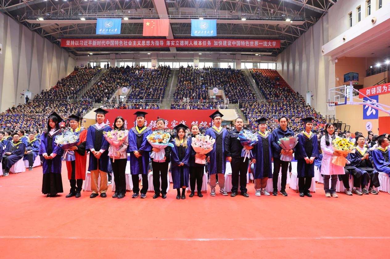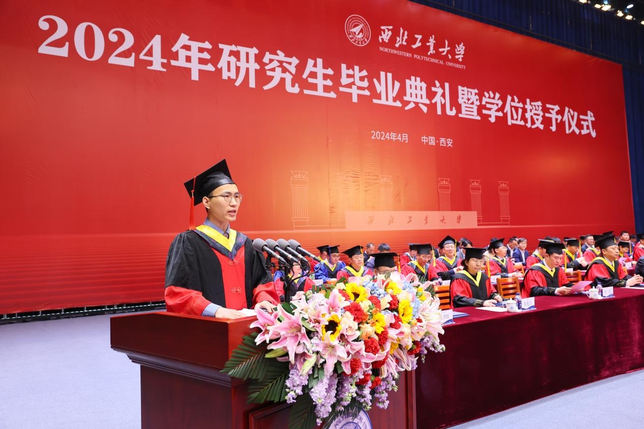 毕业生代表、材料学院博士研究生胡逗代表全体毕业生向精心培养大家的母校、老师家人和朋友致以最衷心的感谢。他说,母校之于他意味着“此身长报国,仗剑戍神州”的文化底色,意味着“十年磨一剑,敢为天下先”的精神品格,意味着“剑戟多砥砺,愿守四海平”的远大志气。未来他将带着母校的荣光、带着师长的祝福,去不断锤炼“低调务实、兼收并蓄、厚积薄发、为国铸剑”的工大特质,向着星辰大海的更远更深处全力进发,以青春之我、以工大之我,去书写更加璀璨的人生华章。