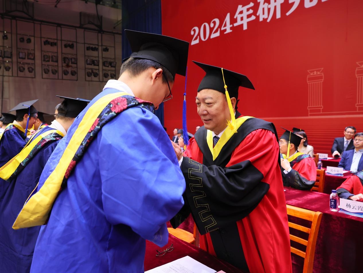 出席毕业典礼的校领导、院士、杰出校友为优秀毕业生代表颁发荣誉证书,对他们在学习科研中取得的丰硕成果表示热烈祝贺。