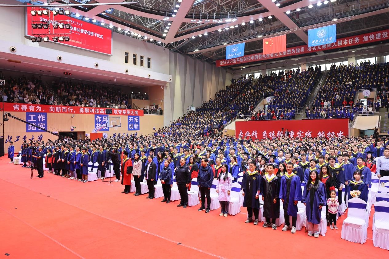 典礼在庄严的国歌声中拉开帷幕,毕业生们身着学位服肃然站立,齐唱国歌。