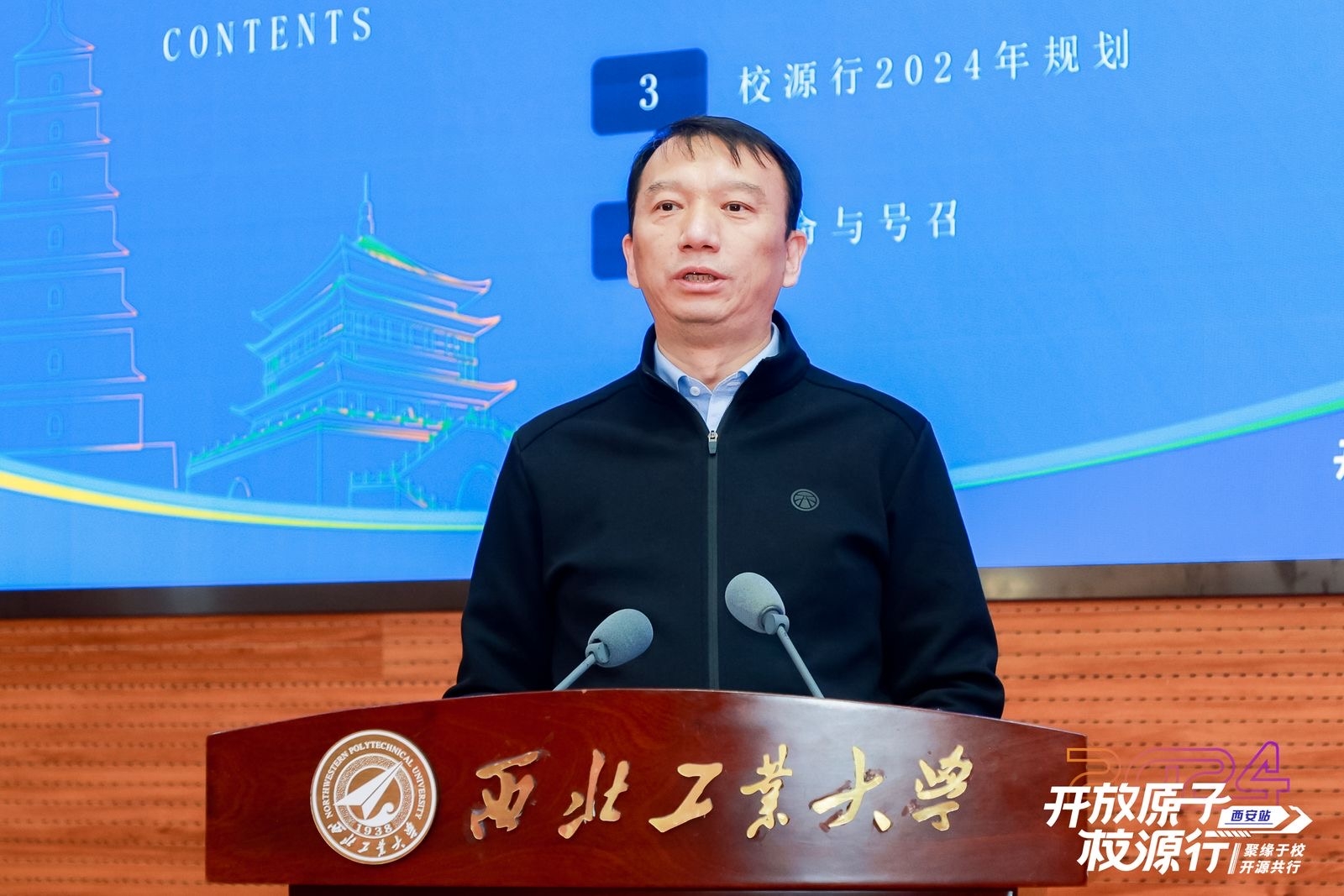 李言荣代表学校向本次活动的举办表示祝贺,向出席活动的各位领导、专家和师生们表示欢迎。他说,高校是培养开源人才,推动开源技术创新、弘扬开源精神的重要力量。他简要介绍了学校特色后说,西工大是国内较早开展软件技术和软件工程研究的高校,学校聚焦开源战略,着力为开源人才培养、技术创新提供有力支撑。未来,学校将携手推广开源文化、推动开源实践和繁荣开源生态,为科技自立自强作出贡献。