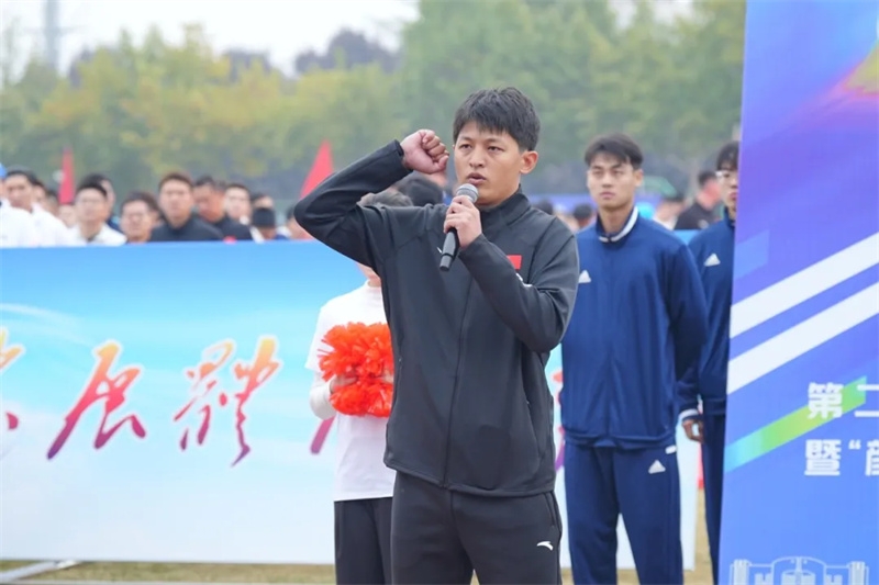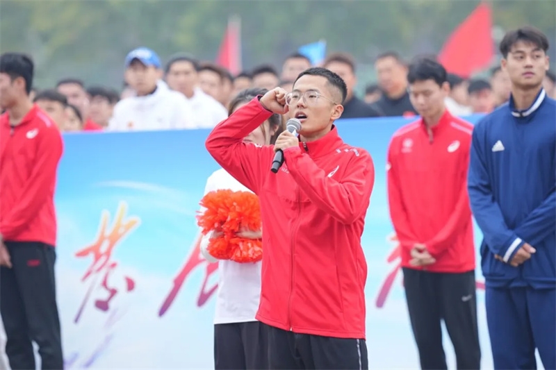 中国大学生田径项群赛(中长跑、投掷、竞走)男子丙组3000米障碍冠军赵铭旋、体育部青年教师张冉分别代表全体参赛运动员、裁判员宣誓。