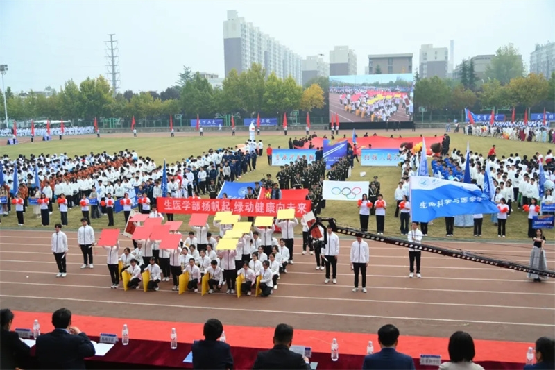 秋意正浓、金风送爽,体育场锣鼓震天、师生欢腾,伴随着欢快的运动员进行曲,国旗方阵、展板方阵、红旗队、鲜花队、裁判员方阵、冠军方阵和来自不同院系的运动员方阵等,先后入场。今后两天里,29支代表队将在赛场上你追我赶、不屈不挠,向着“更高、更快、更强”,以无畏的姿态绽放青春风采。