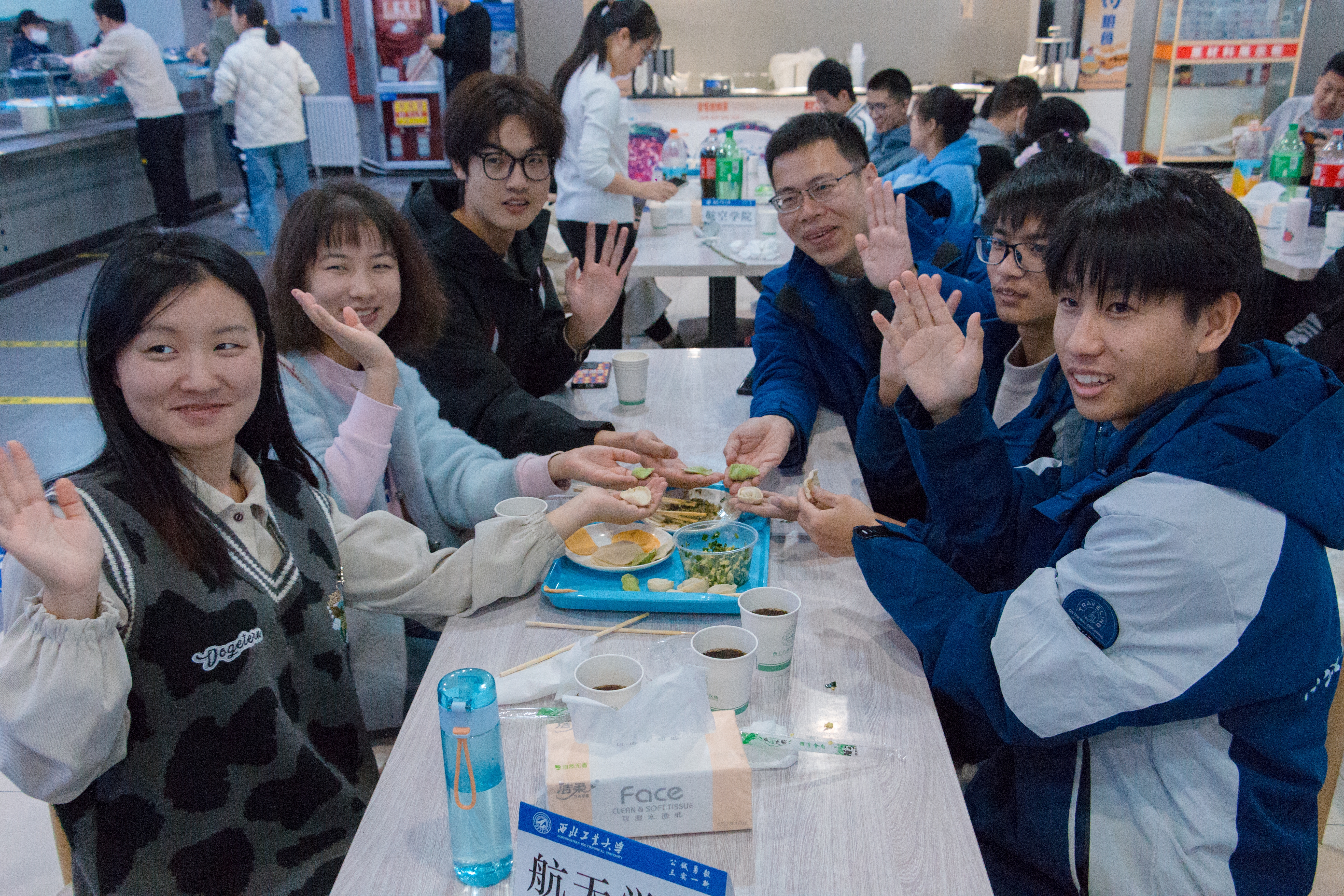 采摘结束,来自全校各培养单位的350余名同学分组落座在海天苑1楼餐厅,从摘、洗、制作到烹饪,体验全过程劳动实践。同学们亲手将采摘的韭菜调制成饺子馅,发挥创意,动手实践,精心制作出不同造型的饺子。伴随着12道由自产无公害蔬菜烹制的菜肴和饺子上桌,师生们欢笑举杯,一起品味美味佳肴,感受丰收的喜悦。