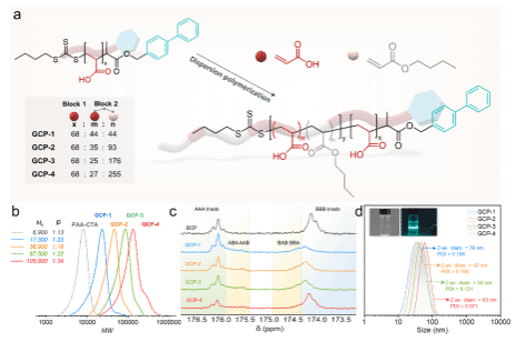 具体而言,运用可逆加成-断裂链转移(RAFT)聚合作实现分散聚合,设计并合成了一系列由两相纳米结构组成的不同嵌段比例的室温磷光高分子(GCPs)(图2)。