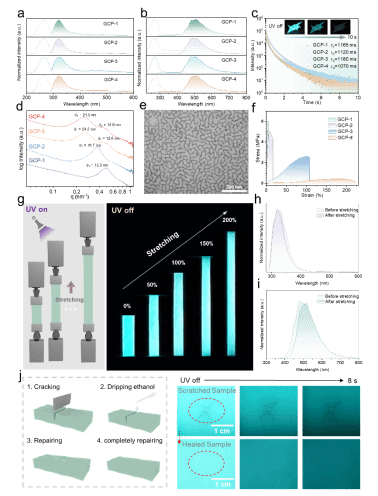 (a)稳态激发和发射光谱;(b)磷光激发和发射光谱;(c)在490 nm处的磷光寿命衰减曲线;(d)SAXS曲线;(e)TEM照片;(f)应力-应变曲线;(g)GCP-4在拉伸至不同应变下的示意图及RTP照片;拉伸前后GCP-4的(h)稳态发射光谱及(i)磷光发射光谱;(j)GCP-4样品的修复示意图及修复前后的RTP照片