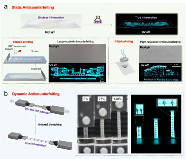 (b)动态防伪展示:通过拉伸展示薄膜隐藏的真实信息