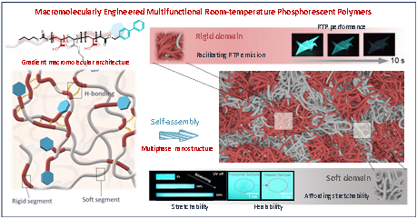 室温磷光(RTP)是一种不同于荧光的发光现象,在防伪材料、分子开关和生物成像等领域有着广泛的应用。与传统的无机或金属-有机RTP体系相比,纯有机RTP材料具有毒性低、成本低和可加工性好等优势,取得了迅速发展,并呈现广泛的应用前景。然而,由于有机化合物强非辐射速率常数和弱自旋轨道耦合,导致其三重态发射容易受到猝灭的影响,因此,超长寿命和高量子效率的室温磷光材料相对较难获得。高分子材料具备出色的柔韧性、易于加工和低成本等特点。在高分子体系中,各种相互作用(如氢键、离子键、共价键)能够有效阻止分子运动,抑制非辐射衰减,从而有助于实现高效的高分子磷光发射。然而,基于上述策略制备的RTP高分子材料的功能可调性(特别是力学性能)受到限制,本质上是由于缺乏调控室温磷光大分子结构和聚集态结构的有效手段。