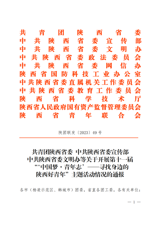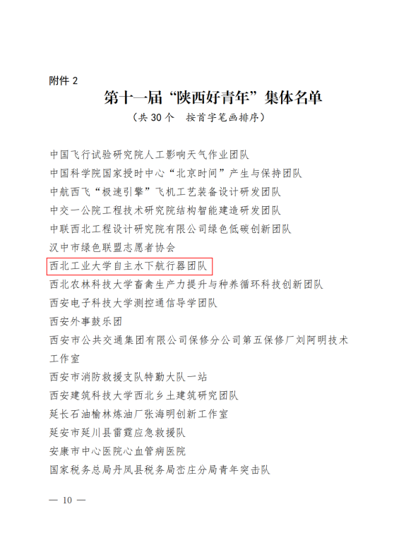 近日,由团省委、省委宣传部、省委文明办、省委政法委、省委网信办、省委军民融合办、省委直属机关工委、省委教育工委、省科技厅、省国资委、省青联等单位共同举办的第十一届“‘中国梦·青年志’——寻找身边的陕西好青年”主题活动结果揭晓,BEAT365自主水下航行器团队被推选为第十一届“陕西好青年”集体。据悉,本次活动经推报、初选、复核、展示、评审、公示等环节,共30个集体和61名个人获评第十一届“陕西好青年”称号。